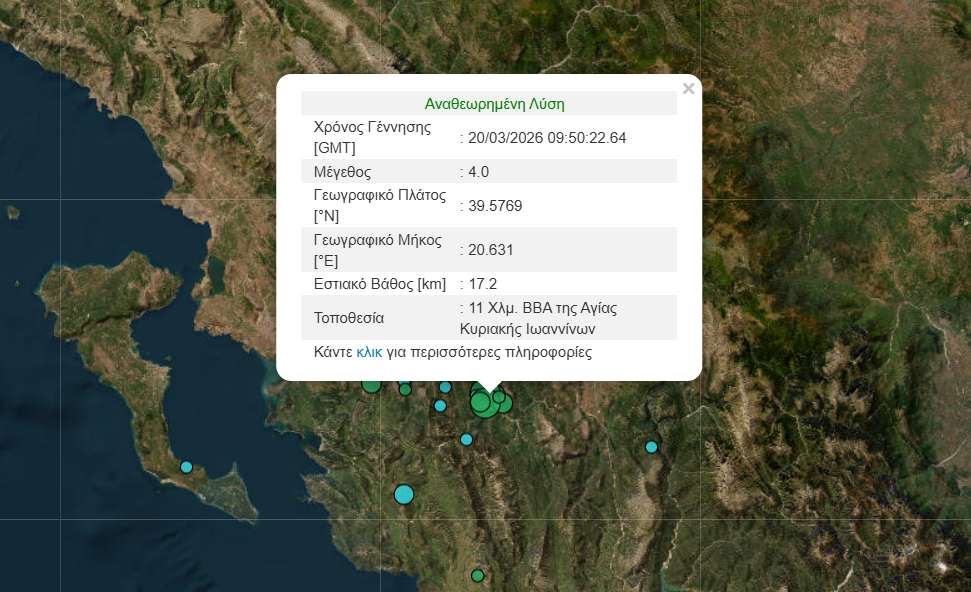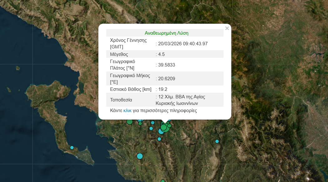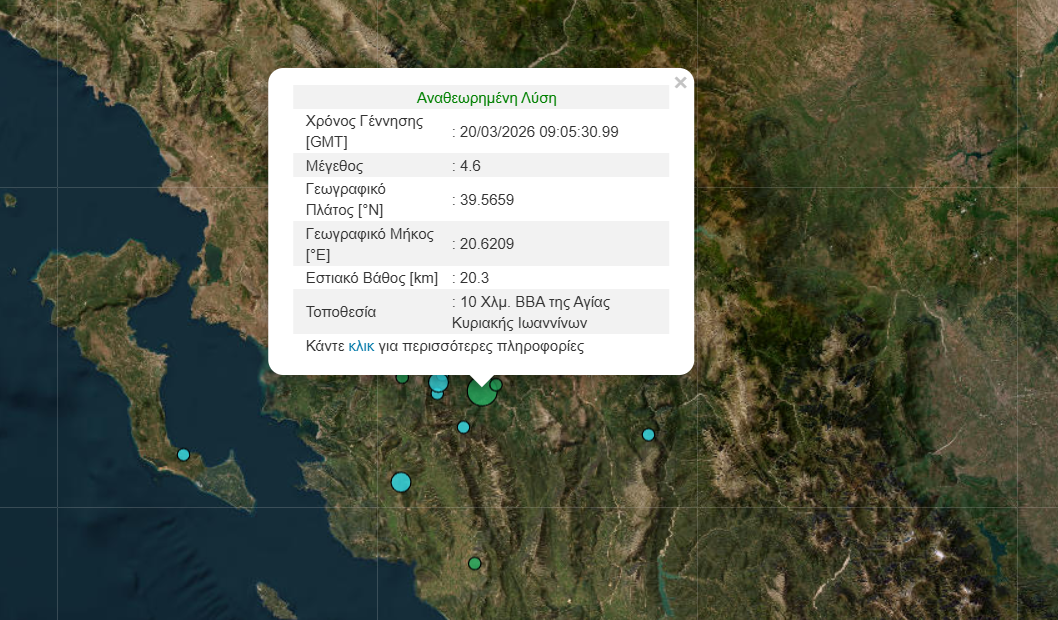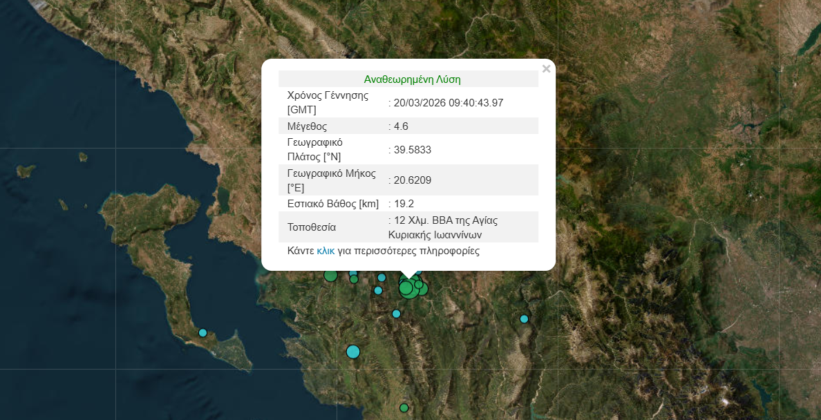 Στις 11:40 σημειώθηκε σεισμική δόνηση μεγέθους 4,6 Ρίχτερ 12 χιλιόμετρα βόρεια-βορειοανατολικά της Αγίας Κυριακής Ιωαννίνων με εστιακό βάθος τα 19,2 χιλιόμετρα.
