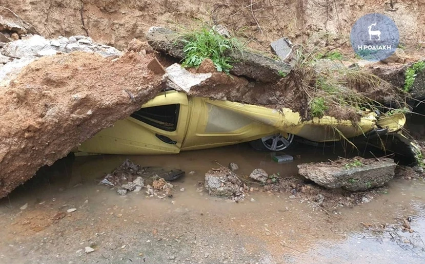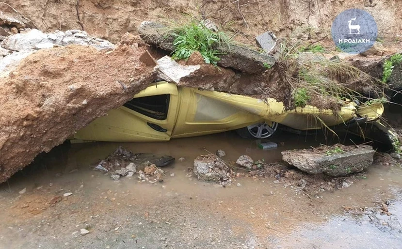 Ο τοίχος όπως φαίνεται στις φωτογραφίες που δημοσιεύει η «Ροδιακή» δεν καταπλάκωσε απλώς τα αυτοκίνητα, αλλά τα συνέθλιψε.