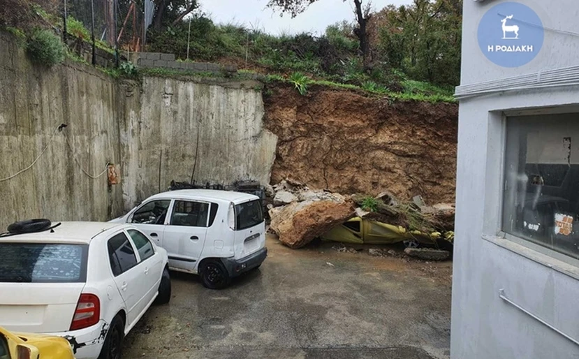 «Χαλκομανία» έγιναν δύο αυτοκίνητα που ήταν σταθμευμένα σε χώρο συνεργείου που βρίσκεται επί της Ρόδου – Λίνδου, όταν σήμερα το πρωί κατέρρευσε ένα τεράστιο τμήμα τοίχου, εξαιτίας προφανώς των ραγδαίων βροχοπτώσεων των τελευταίων ημερών, ενδεχομένως και κακοτεχνίας.