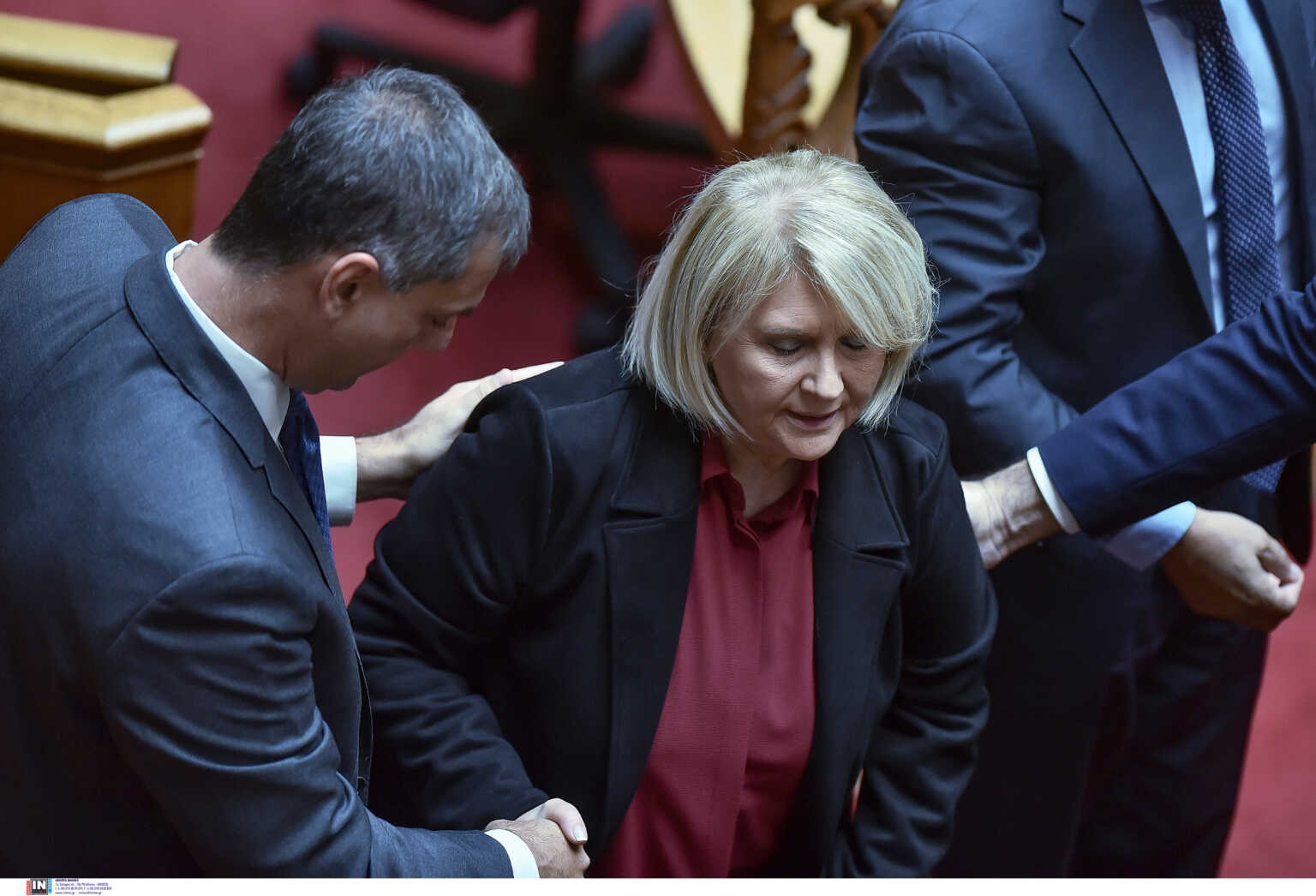 Αμέσως βουλευτές της Νέας Δημοκρατίας έτρεξαν να τη σηκώσουν και φάνηκε πως η Σοφία Βούλτεψη χτύπησε λίγο στο γόνατό της.