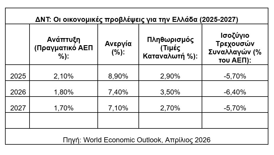 Σε σημαντική αναθεώρηση των προβλέψεών του για την ελληνική οικονομία προχωρά το Διεθνές Νομισματικό Ταμείο, με εκτίναξη της ακρίβειας και υποχώρηση των ρυθμών ανάπτυξης λόγω της εμπόλεμης κατάστασης στη Μέση Ανατολή. Στην νέα Έκθεσή του World Economic Outlook το Ταμείο προβλέπει ότι η διεθνής κρίση το 2026 θα κοστίσει στην Ελλάδα 0,4 ποσοστιαίες μονάδες του ΑΕΠ (επιδείνωση σε σχέση με τις προηγούμενες εκτιμήσεις του Ταμείου). Ανοίγει, έτσι, τον δρόμο και στο οικονομικό επιτελείο της κυβέρνησης να προβεί και αυτό, στα τέλη του μηνός, σε αντίστοιχη -επί τα χείρω- αναθεώρηση των προβλέψεων στις οποίες είχε στηρίξει τον κρατικό προϋπολογισμό για το 2026.
