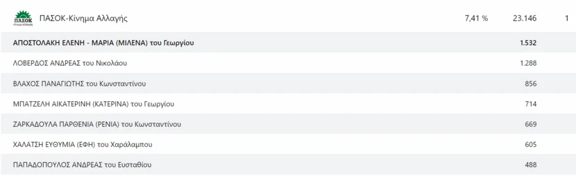 Συγκεκριμένα, η Μιλένα Αποστολάκη προηγείται με 1.729 σταυρούς, έναντι του βετεράνου πολιτικού του ΠΑΣΟΚ που παίρνει μέχρι στιγμής 1.446 Σταυρούς.