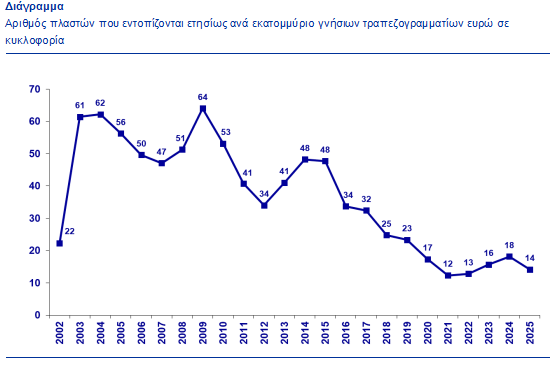 Περίπου 444.000 πλαστά χαρτονομίσματα ευρώ αποσύρθηκαν από την κυκλοφορία το 2025, σύμφωνα με ανακοίνωση της Ευρωπαϊκής Κεντρικής Τράπεζας (ΕΚΤ), καταγράφοντας μείωση κατά 20% σε σύγκριση με το προηγούμενο έτος. Όπως επισημαίνεται, ο αριθμός των πλαστών τραπεζογραμματίων είναι πολύ χαμηλός σε σχέση με τα γνήσια τραπεζογραμμάτια ευρώ σε κυκλοφορία, καθώς εντοπίστηκαν 14 πλαστά ανά εκατομμύριο γνήσιων τραπεζογραμματίων σε κυκλοφορία.