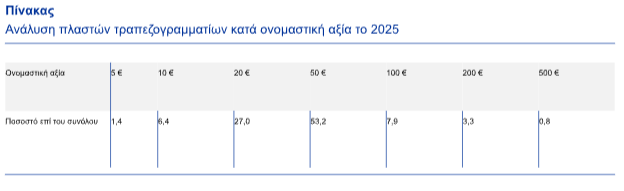 Σύμφωνα με την ΕΚΤ, τα χαρτονομίσματα των 20 και των 50 ευρώ εξακολούθησαν να καταγράφουν τα υψηλότερα ποσοστά παραχάραξης. Οι δύο αυτές ονομαστικές αξίες αντιστοιχούσαν μαζί σε περίπου 80% του συνόλου των πλαστών τραπεζογραμματίων ευρώ. 96,8% των πλαστών τραπεζογραμματίων εντοπίστηκαν σε χώρες της ζώνης του ευρώ, ενώ 2,2% σε κράτη μέλη της ΕΕ εκτός ζώνης ευρώ και 1,0% σε άλλα μέρη του κόσμου.