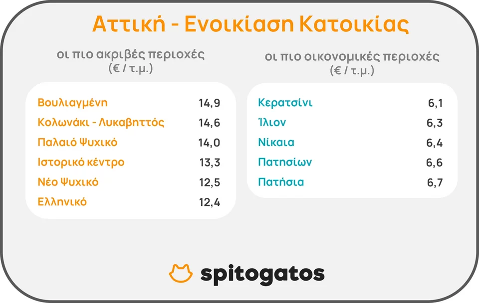 Ειδικότερα στις ακριβότερες περιοχές συγκαταλέγονται η Βουλιαγμένη, το Κολωνάκι-Λυκαβηττός, το Παλαιό και Νέο Ψυχικό, το Ιστορικό Κέντρο και το Ελληνικό. Από την άλλη, οι πιο οικονομικές περιοχές είναι το Κερατσίνι, το Ίλιον, η Νίκαια και τα Πατήσια.