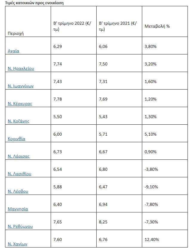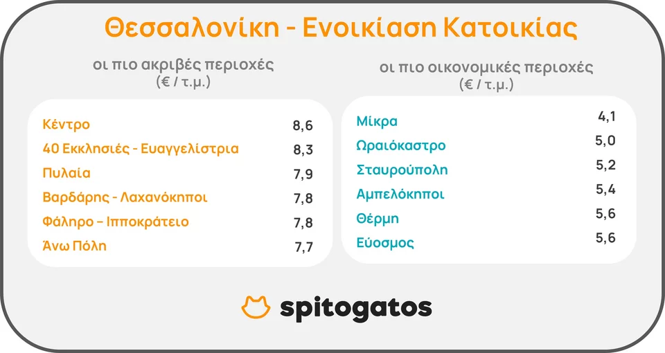 Ως προς την ενοικίαση στη Θεσσαλονίκη, η υψηλότερη μέση ζητούμενη τιμή παρατηρείται σε περιοχές του Δήμου Θεσσαλονίκης όπως το κέντρο, οι 40 Εκκλησιές-Ευαγγελίστρια, η Πυλαία, ο Βαρδάρης – Λαχανόκηποι, το Φάληρο-Ιπποκράτειο και η Άνω Πόλη. Από την άλλη, το δεύτερο τρίμηνο του έτους οι οικονομικότερες περιοχές εντοπίζονται στα προάστια και συγκεκριμένα στον Δήμο Μίκρας, το Ωραιόκαστρο, τη Σταυρούπολη, τους Αμπελόκηπους, τη Θέρμη και τον Εύοσμο.