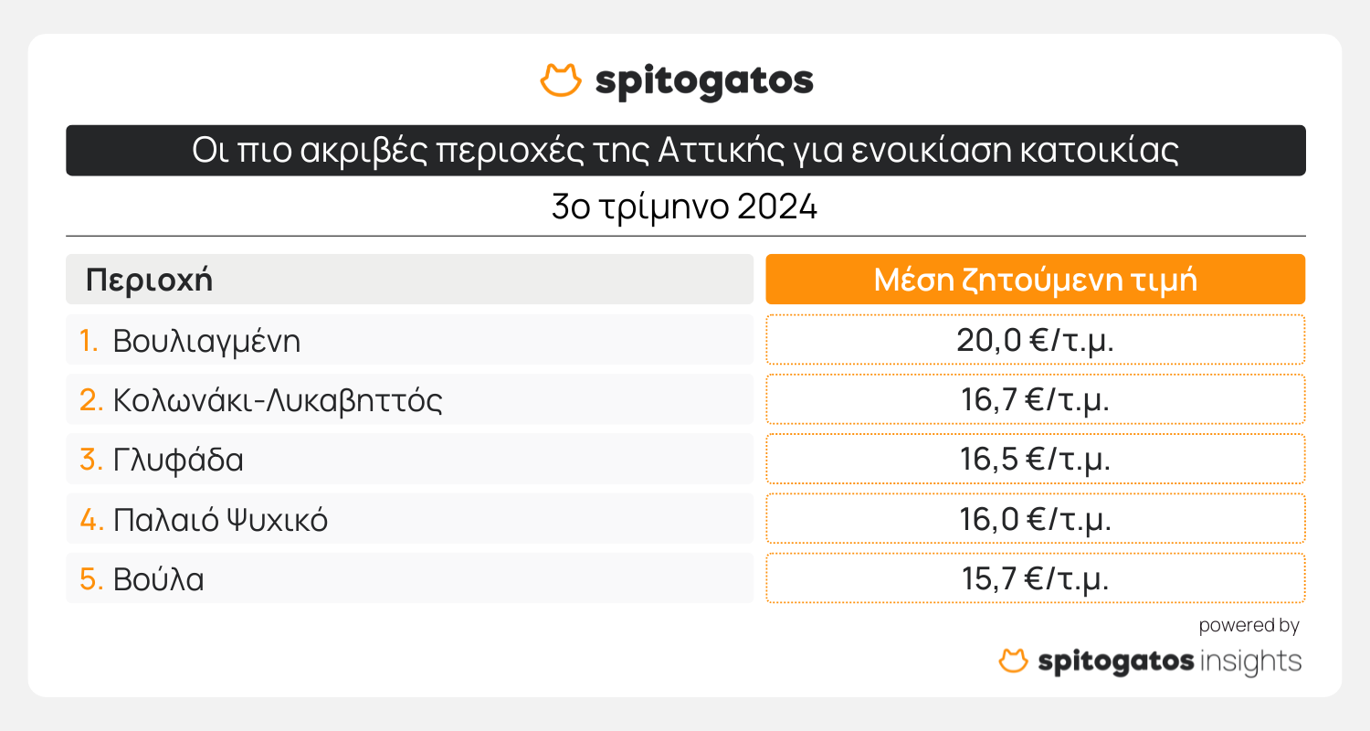 Σύμφωνα με τα στοιχεία του δείκτη τιμών SPI της Spitogatos οι μεγαλύτερες αυξήσεις μέσης ζητούμενης τιμής ενοικίασης το τρίτο τρίμηνο σημειώθηκαν στο Νέο Φάληρο (31,4%), στον Αγιο Στέφανο (24,9%), στην περιοχή Πειραϊκή – Χατζηκυριάκειο (23,3%), στη Βάρη – Βάρκιζα (23,0%) και στον Μαραθώνα (22,2%). Όσον αφορά τις ακριβότερες περιοχές, αυτές είναι τα νότια προάστια της Αττικής, οι Κυκλάδες, τα βόρεια προάστια, το κέντρο της Αθήνας και ο Πειραιάς.