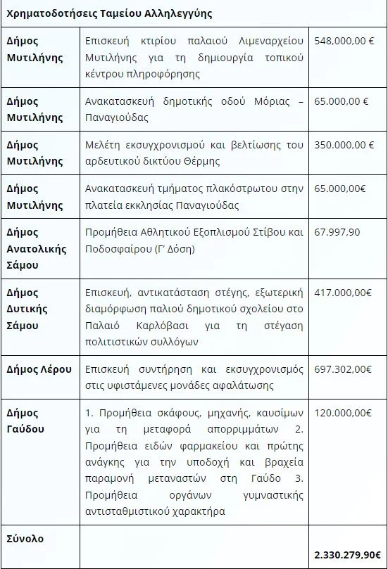 Πιο συγκεκριμένα, οι δήμοι Μυτιλήνης, Ανατολικής και Δυτικής Σάμου, Λέρου και Γαύδου, επιδοτούνται με επιπλέον 2.330.279,90Euro εκ. ευρώ συνολικά, για έργα και εξοπλισμό, μετά από προτάσεις που κατέθεσαν, κατά την κρίση τους και βάσει των τοπικών αναγκών.