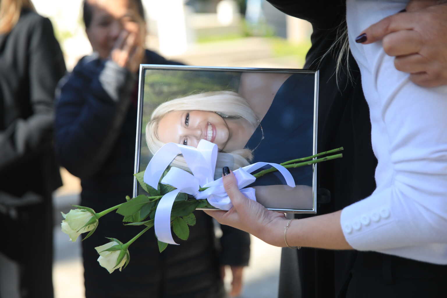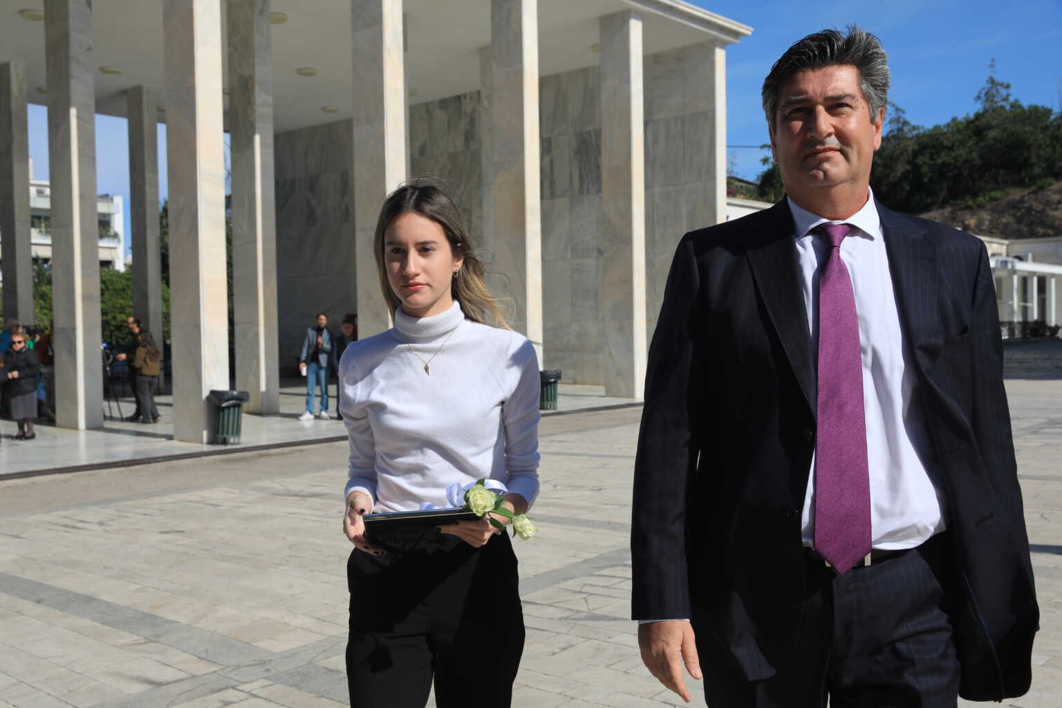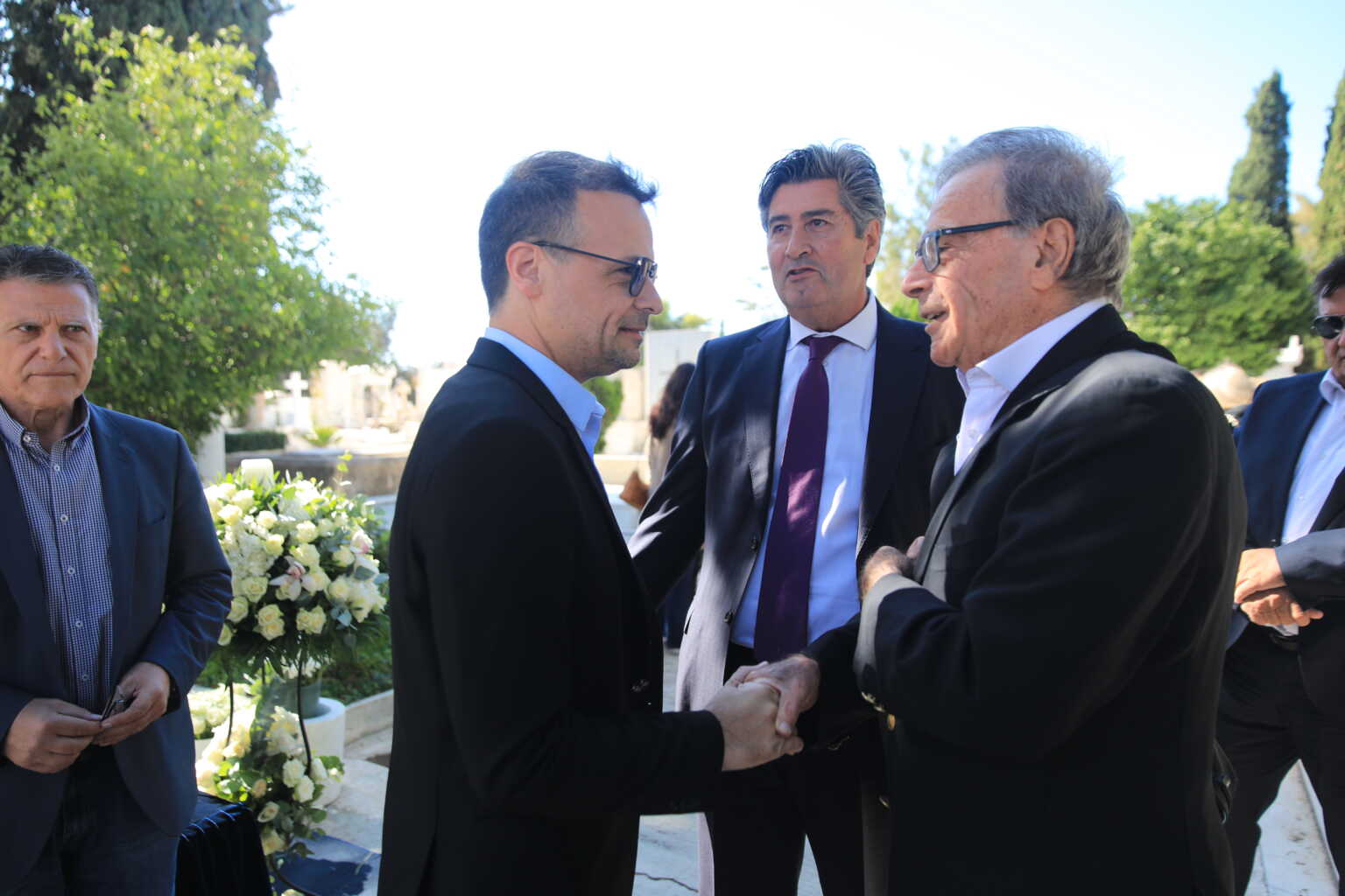 Όλοι κρατώντας λευκά τριαντάφυλλα πάνω από τον οικογενειακό τάφο της οικογένειας Γεννηματά.
