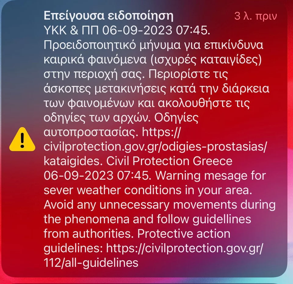 «Προειδοποιητικό μήνυμα για επικίνδυνα καιρικά φαινόμενα (ισχυρές καταιγίδες στην περιοχή σας. Περιορίστε τις άσκοπες μετακινήσεις κατά την διάρκεια των φαινομένων και ακολουθήστε τις οδηγίες των Αρχών», αναφέρει το σχετικό μήνυμα.