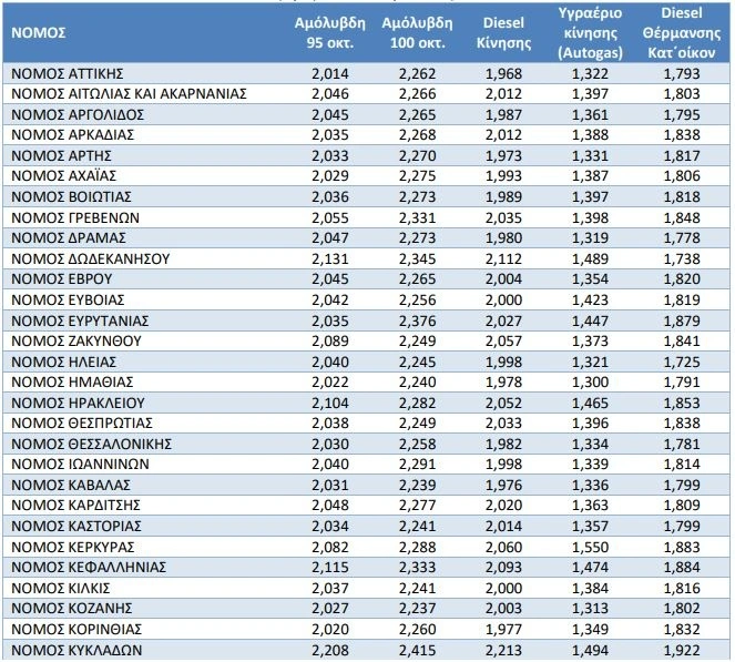 Παράλληλα, στις Κυκλάδες και στα Δωδεκάνησα καταγράφονται και οι υψηλότερες τιμές πετρελαίου κίνησης με 2,213 ευρώ/λίτρο και 2,112 ευρώ/λίτρο, αντίστοιχα.
