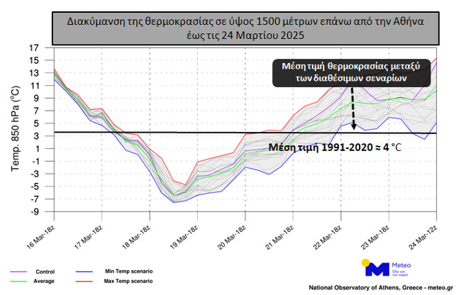 Εικόνα 1. Διακύμανση και μέση τιμή (περίοδος αναφοράς: 1991-2020) της θερμοκρασίας σε ύψος 1500 μέτρων έως τις 24/03