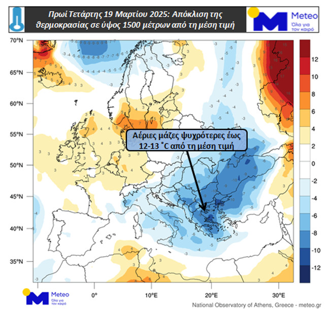 Στην Εικόνα 2 παρουσιάζεται η απόκλιση της θερμοκρασίας σε ύψος 1500 μέτρων* από τη μέση τιμή της περιόδου 1979-2010. Σε αυτή φαίνεται ότι το πρωί της Τετάρτης 19/03 η θερμοκρασία σε ύψος 1500 μέτρων θα είναι έως και 12-13 ˚C χαμηλότερη της μέση τιμής.