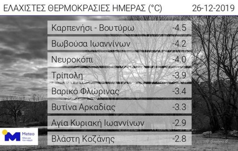 Οι χαμηλότερες ελάχιστες θερμοκρασίες, σύμφωνα με το δίκτυο αυτόματων μετεωρολογικών σταθμών του Εθνικού Αστεροσκοπείου Αθηνών/meteo.g, καταγράφηκαν το πρωί της Πέμπτης στη Βουτύρω του Καρπενησίου (-4,5), στη Βωβούσα Ιωαννίνων (-4,2), στο Νευροκόπι (-4), στην Τρίπολη (-3,9), στο Βαρικό Φλώρινας (-3,4) και στη Βυτίνα Αρκαδίας (-3,3 βαθμοί).