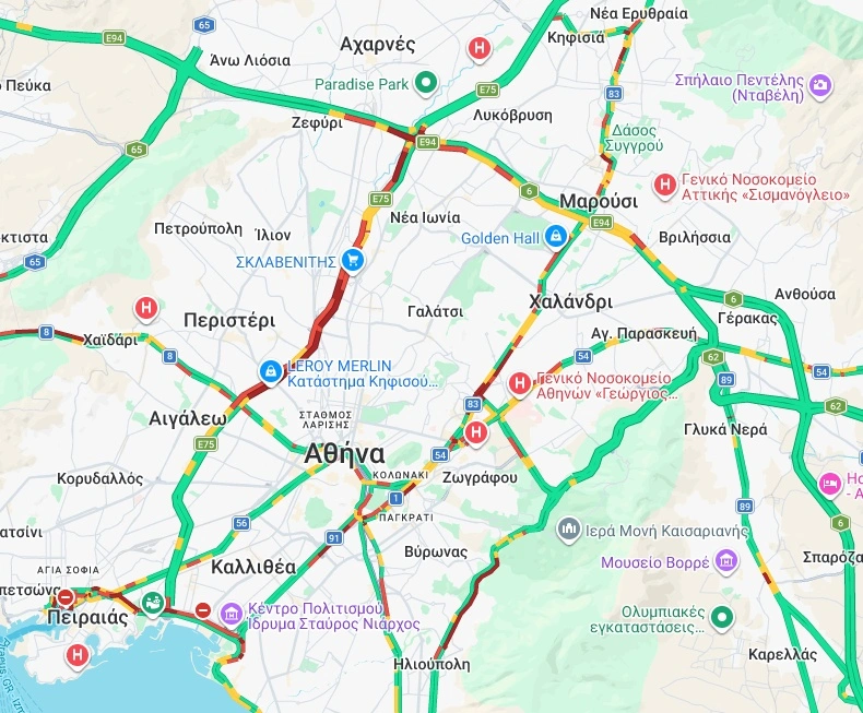 Ιδιαίτερα προβλήματα καταγράφονται στον Κηφισό και στα δύο ρεύματα, όπου η κυκλοφορία διεξάγεται με χαμηλές ταχύτητες, κυρίως στο τμήμα από το Αιγάλεω έως τη Μεταμόρφωση, αλλά και στην αντίθετη κατεύθυνση.