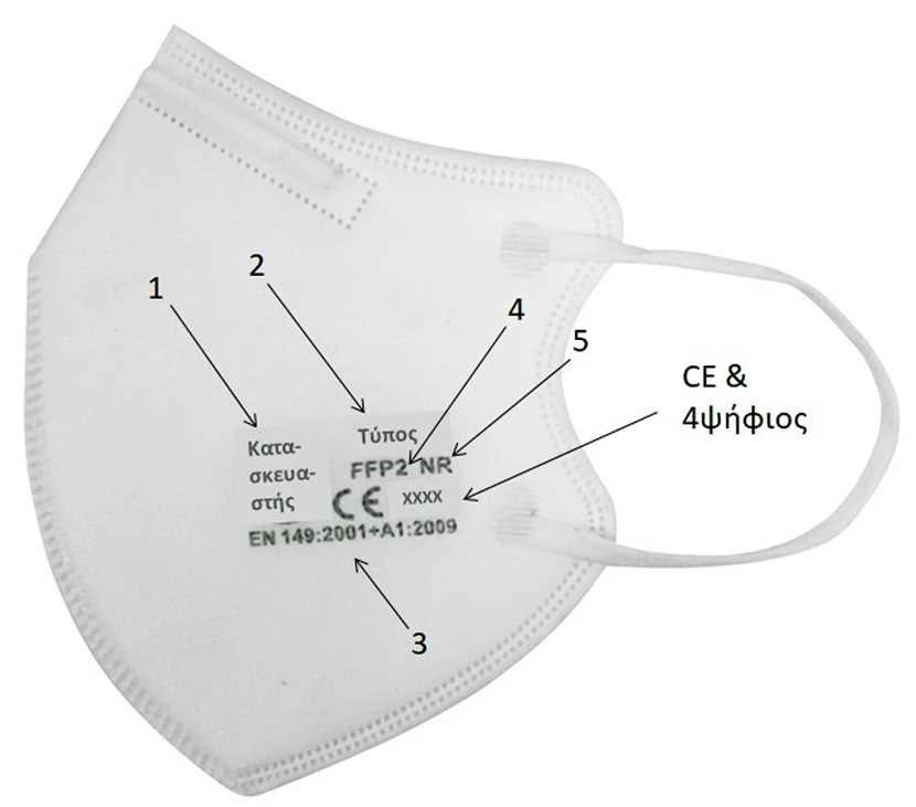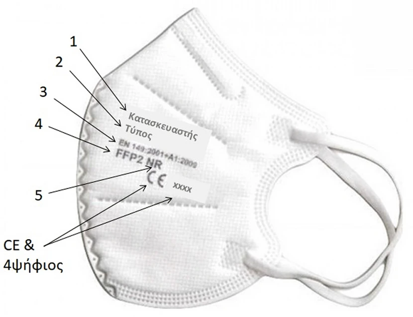 2. Η σήμανση CE συνοδεύεται από έναν τετραψήφιο αριθμό, που προσδιορίζει τον οργανισμό πιστοποίησης της μάσκας (κοινοποιημένος οργανισμός-Notified Body –NB). O κοινοποιημένος οργανισμός διενεργεί τη διαδικασία αξιολόγησης της συμμόρφωσης της μάσκας. Οι οργανισμοί κοινοποίησης με έγκυρη κοινοποίηση για ΜΑΠ φαίνονται στην ακόλουθη ιστοσελίδα της Ε.Ε: https://ec.europa.eu/growth/tools-databases/nando/index.cfm?fuseaction=directive.notifiedbody&dir_id=155501.