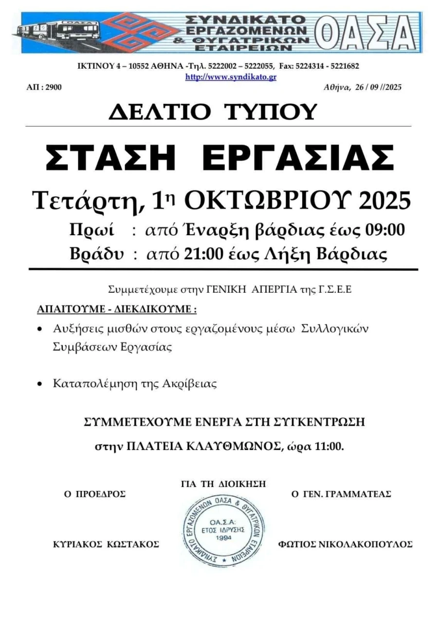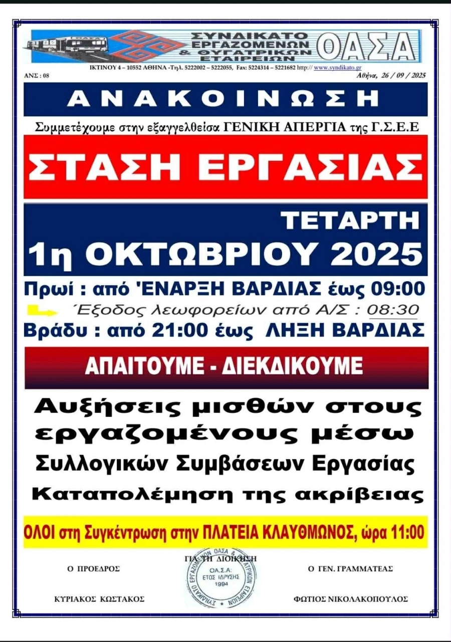 Στάση εργασίας πραγματοποιούν οι εργαζόμενοι του ΟΑΣΑ την Τετάρτη 1 Οκτωβρίου, συμμετέχοντας στη γενική απεργία που έχει κηρύξει η ΓΣΕΕ. Η κινητοποίηση θα ξεκινήσει από την έναρξη της πρωινής βάρδιας έως τις 09:00 και θα συνεχιστεί από τις 21:00 έως τη λήξη της βάρδιας.