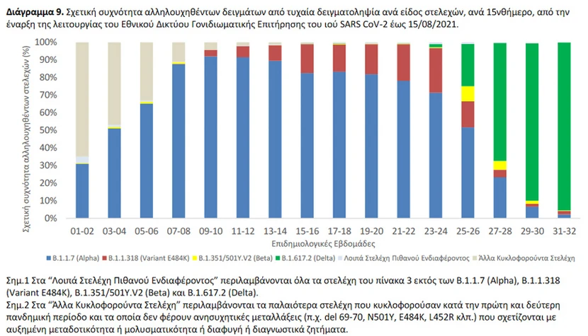 «Ολοκληρώθηκε από το Eθνικό Δίκτυο Γονιδιωματικής Επιτήρησης του ιού SARS-CoV-2, που λειτουργεί υπό το συντονισμό του ΕΟΔΥ, η γονιδιωματική ανάλυση σε 2.044 δείγματα που έχουν επιλεγεί τυχαιοποιημένα ή στοχευμένα και αφορούν στην περίοδο 19 Ιουλίου 2021 έως 16 Αυγούστου 2021.