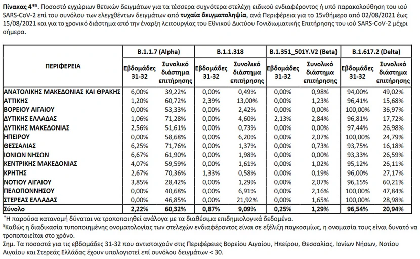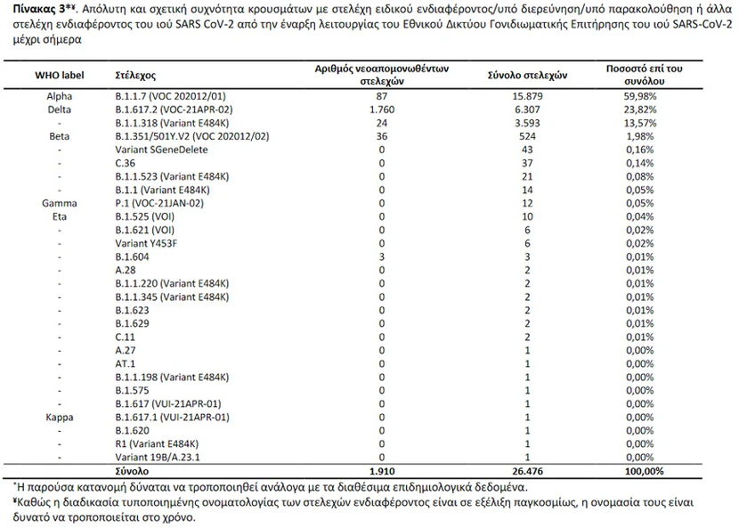 Εκ των 1.883 δειγμάτων με στελέχη ειδικού ενδιαφέροντος, τα 1.760 αφορούν στο στέλεχος Delta, 87 αφορούν στο Alpha και 36 αφορούν στο Βeta.