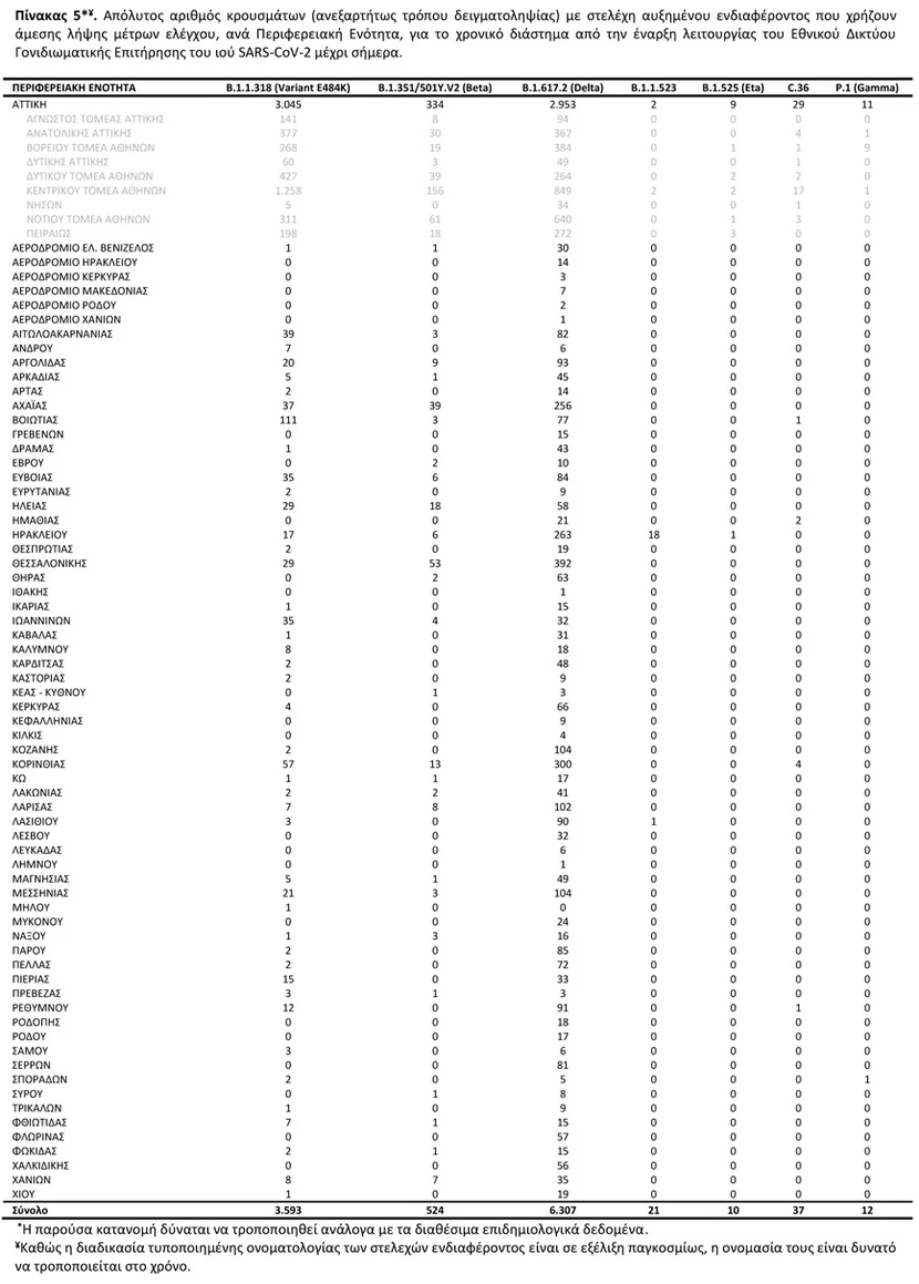 Από τα 3.015 δείγματα που έχουν ληφθεί ή επιλεγεί στοχευμένα, έχουν βρεθεί 2.852 στελέχη ειδικού ενδιαφέροντος ή υπό παρακολούθηση. Από τα δείγματα αυτά, 43,45% αφορούν στο B.1.1.318 (Variant E484K), 28,49% στο Delta, 15,75% στο Alpha, 6,67% στο Beta, 0,13% στο C.36 και 0,10% στο Gamma.