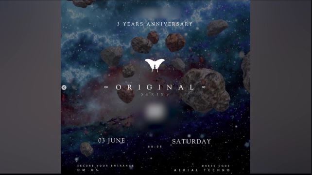 Όπως αναγράφεται και στην πρόσκληση, το dress code ήταν aerial techno ενώ για να εξασφαλίσει κάποιος την είσοδό του θα έπρεπε να στείλει προσωπικό μήνυμα στα social media.