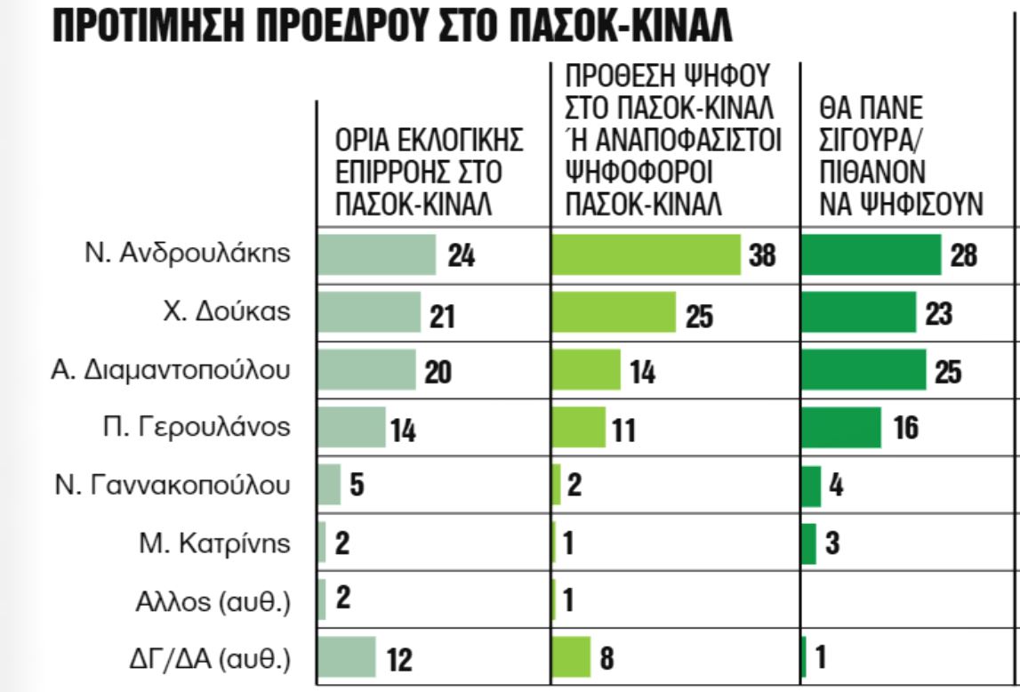 Στο δείγμα όσων δηλώνουν πως θα πάνε να ψηφίσουν, το δίδυμο είναι Νίκος Ανδρουλάκης και Αννα Διαμαντοπούλου, η οποία μπαίνει στον δεύτερο γύρο με 25% έναντι 23% του Δούκα, που έρχεται τρίτος.