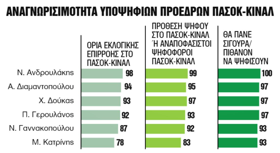 Στο μεγάλο δείγμα της επιρροής του ΠΑΣΟΚ (στο οποίο περιλαμβάνονται όλοι οι δυνητικοί ψηφοφόροι του) αντίπαλός του είναι ο Χάρης Δούκας, με την Αννα Διαμαντοπούλου και τον Παύλο Γερουλάνο να ακολουθούν –τάση που επαναλαμβάνεται με πιο καθαρές διαφορές και στο δείγμα των ψηφοφόρων ΠΑΣΟΚ στις προηγούμενες εκλογές, που σήμερα είναι αναποφάσιστοι.