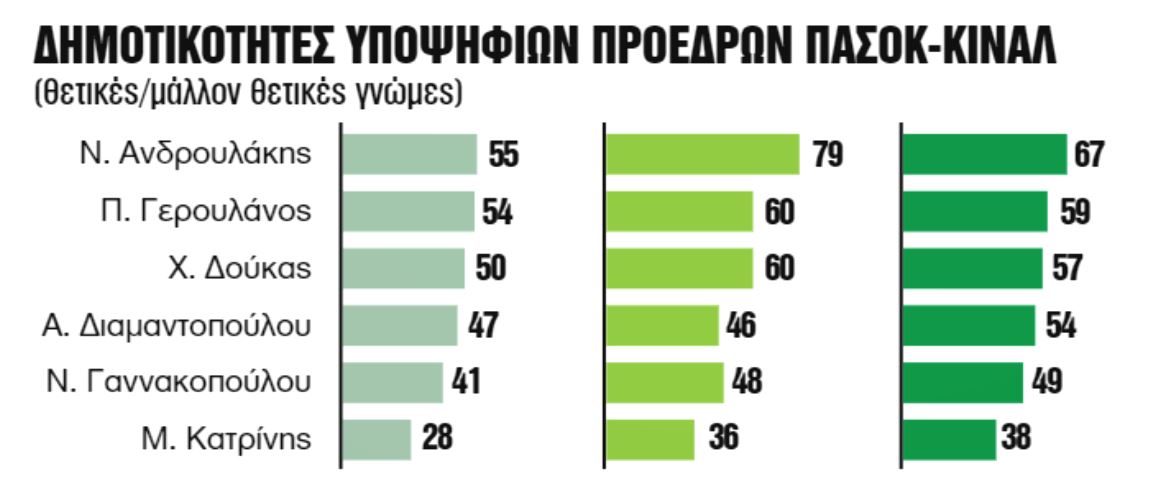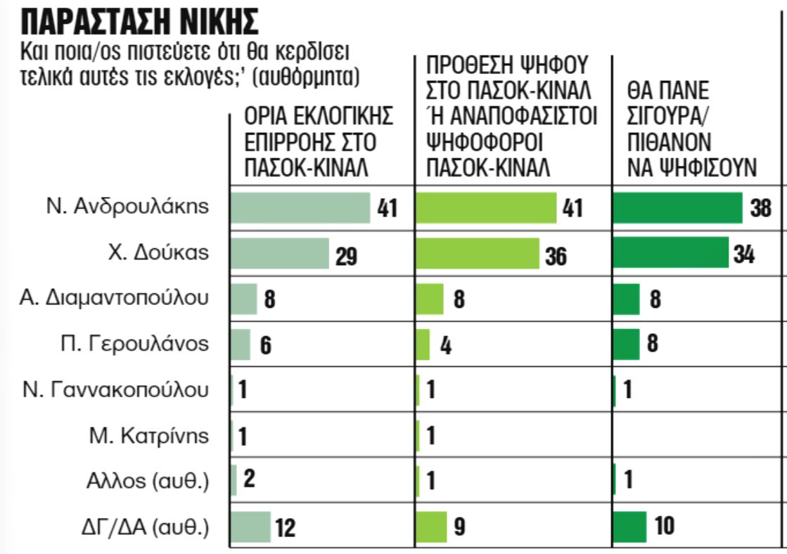 Στην παράσταση νίκης, ανεξαρτήτως δείγματος, η πρωτιά ανήκει επίσης στον Ανδρουλάκη, με τον Δούκα να έρχεται δεύτερος και να κλείνει την ψαλίδα σε 38% – 34% στους ψηφοφόρους που σίγουρα θα βρεθούν στις εσωκομματικές κάλπες του Οκτωβρίου – στο συγκεκριμένο ερώτημα, Διαμαντοπούλου και Γερουλάνος κινούνται σε μονοψήφια ποσοστά.