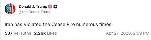 Σε μια εξαιρετικά σύντομη ανάρτηση στο Truth Social, ο Αμερικανός πρόεδρος Ντόναλντ Τραμπ, δήλωσε ότι «το Ιράν έχει παραβιάσει την εκεχειρία πολλές φορές», χωρίς να διευκρινίσει ποιες ήταν αυτές οι παραβιάσεις.