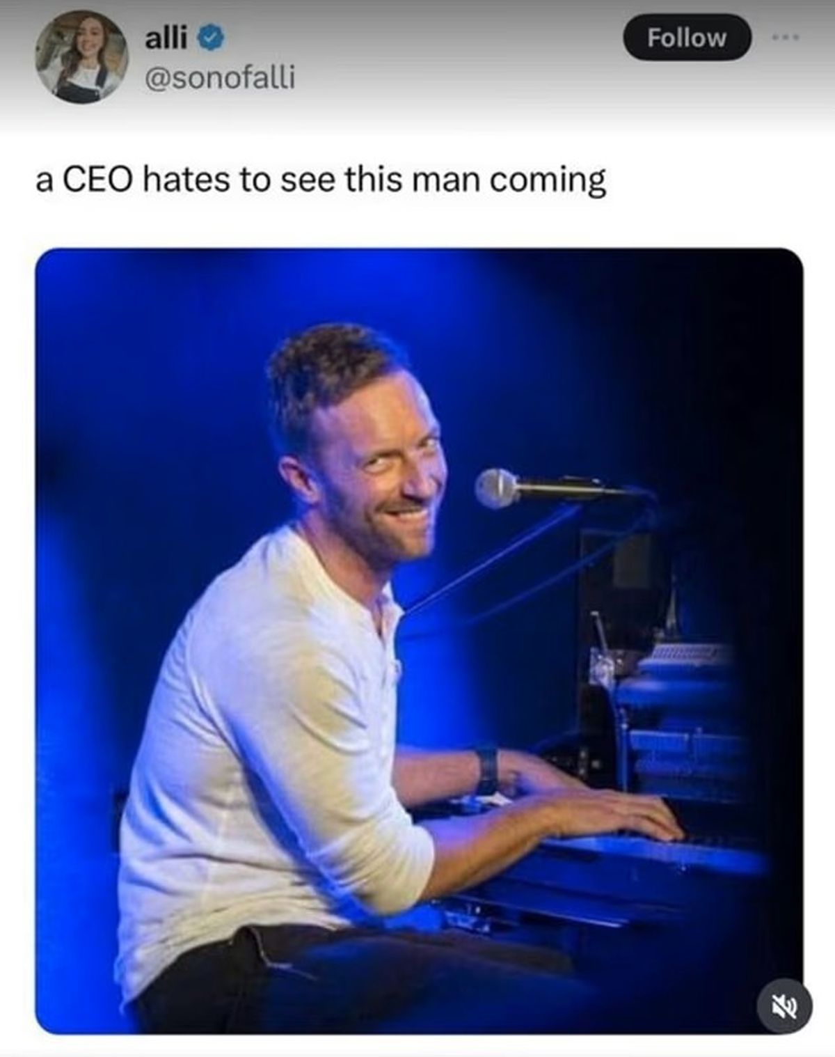 Τα memes έπεσαν βροχή: ένας χρήστης του X (πρώην Twitter) ανέβασε φωτογραφία του Κρις Μάρτιν στο πιάνο με τη λεζάντα: «Κανένας CEO δεν θέλει να βλέπει αυτόν τον άντρα να πλησιάζει».