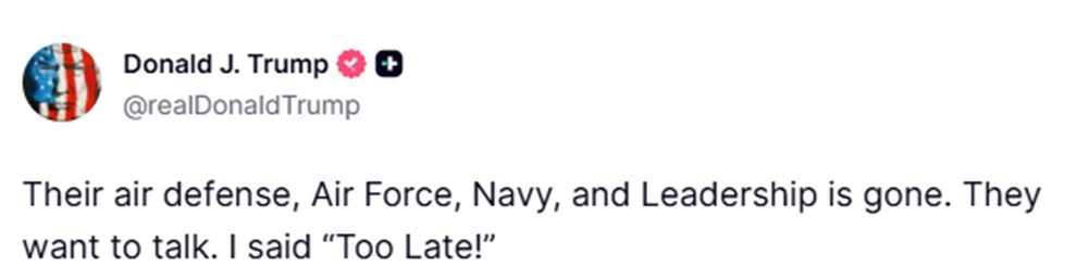 Ιδιαίτερη βαρύτητα, ωστόσο, δίνεται στο σκέλος που αφορά τις διπλωματικές εξελίξεις. Σύμφωνα με τον ίδιο, η Τεχεράνη φέρεται να επιδίωξε να ανοίξει δίαυλο επικοινωνίας, με τον Τραμπ να μεταφέρει χαρακτηριστικά τη φράση «They want to talk» (Θέλουν να συζητήσουν). Παρά την, όπως παρουσιάζεται, πρόθεση της ιρανικής πλευράς για διάλογο, η απάντησή του ήταν απορριπτική και λακωνική: «Πολύ αργά!».
