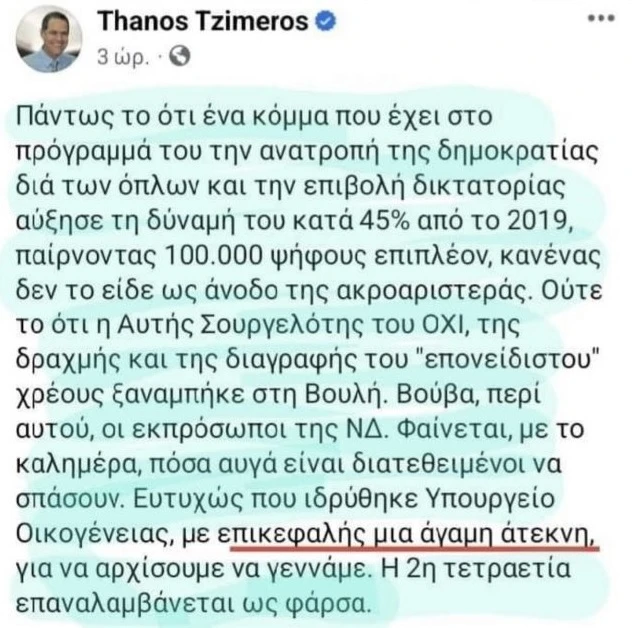 Όσα έγραψε στο Facebook ο Θάνος Τζήμερος για την τοποθέτηση της Σοφίας Ζαχαράκη στο υπουργείο Κοινωνικής Συνοχής και Οικογένειας.
