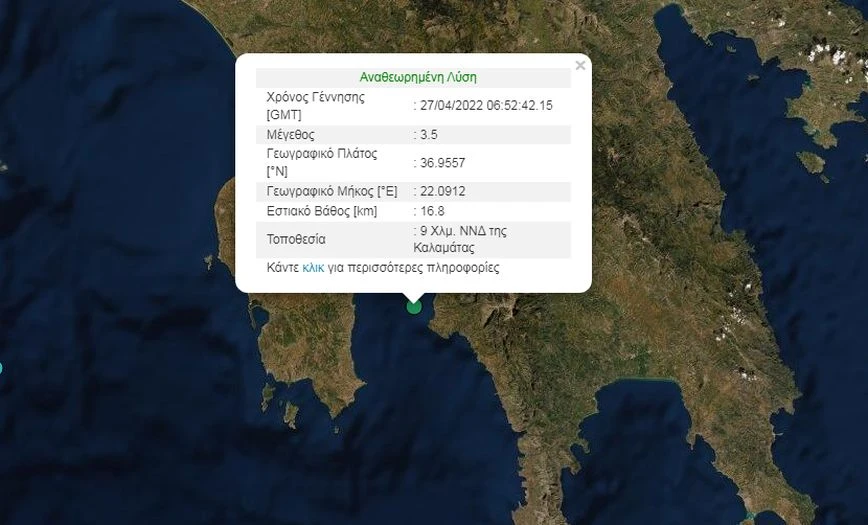 Σεισμός σημειώθηκε πριν από λίγα λεπτά κοντά στην Καλαμάτα. Η σεισμική δόνηση ήταν 3,5 βαθμών της κλίμακας Ρίχτερ.