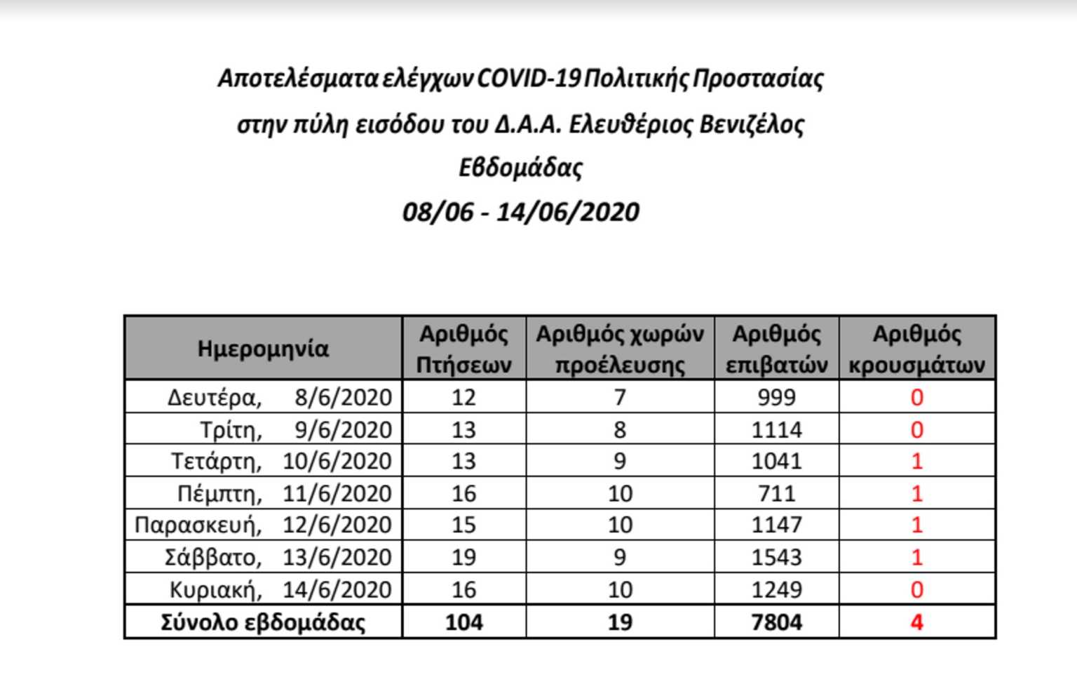 Από αυτούς μόνο 4 επιβάτες βρέθηκαν θετικοί, για τους οποίους ακολουθήθηκαν τα σχετικά υγειονομικά πρωτόκολλα. Οι έλεγχοι από τη Γενική Γραμματεία Πολιτικής Προστασίας σε συνεργασία με τους υπόλοιπους αρμόδιους φορείς θα συνεχιστούν, ώστε να γίνει πράξη το σχέδιο για ασφαλές άνοιγμα του ελληνικού τουρισμού.