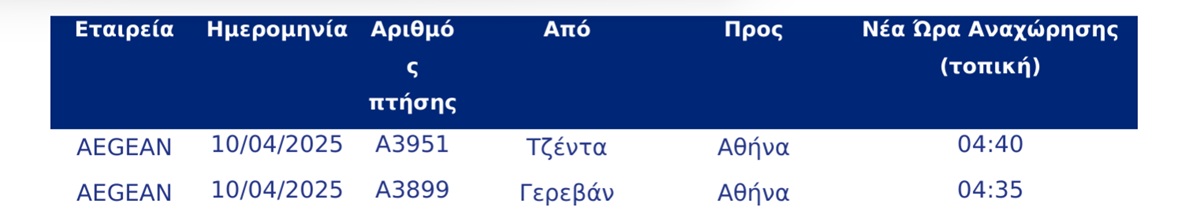 Στον παρακάτω πίνακα ακολουθούν οι πτήσεις που τροποποιούνται: