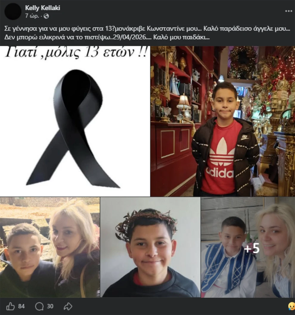 Με λόγια που ραγίζουν καρδιές, η μητέρα του 13χρονου έγραψε: «Σε γέννησα για να μου φύγεις στα 13; Μονάκριβε Κωνσταντίνε μου… Καλό παράδεισο άγγελέ μου… Δεν μπορώ ειλικρινά να το πιστέψω… 29/04/2026… Καλό μου παιδάκι…», συνοδεύοντας την ανάρτηση με φωτογραφίες του παιδιού.