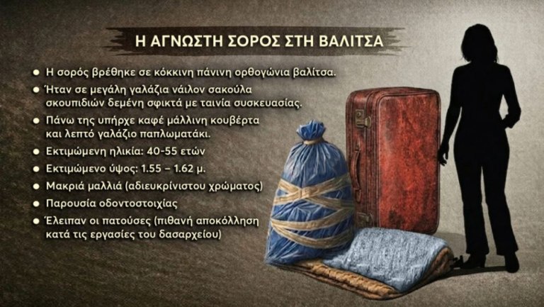 Μια μικροκαμωμένη γυναίκα βρέθηκε δολοφονημένη, τοποθετημένη μέσα σε μια κόκκινη βαλίτσα. Σύμφωνα με όσα αποκάλυψε η εκπομπή η σορός ήταν κλεισμένη ερμητικά σε πλαστική σακούλα σκουπιδιών, δεμένη με πλαστική ταινία συσκευασίας και τυλιγμένη σε κουβέρτα. Μια φαρδιά μαύρη μπλούζα και μια χρυσή βέρα στο δεξί χέρι, τα μόνα στοιχεία στο σκοτεινό γρίφο.
