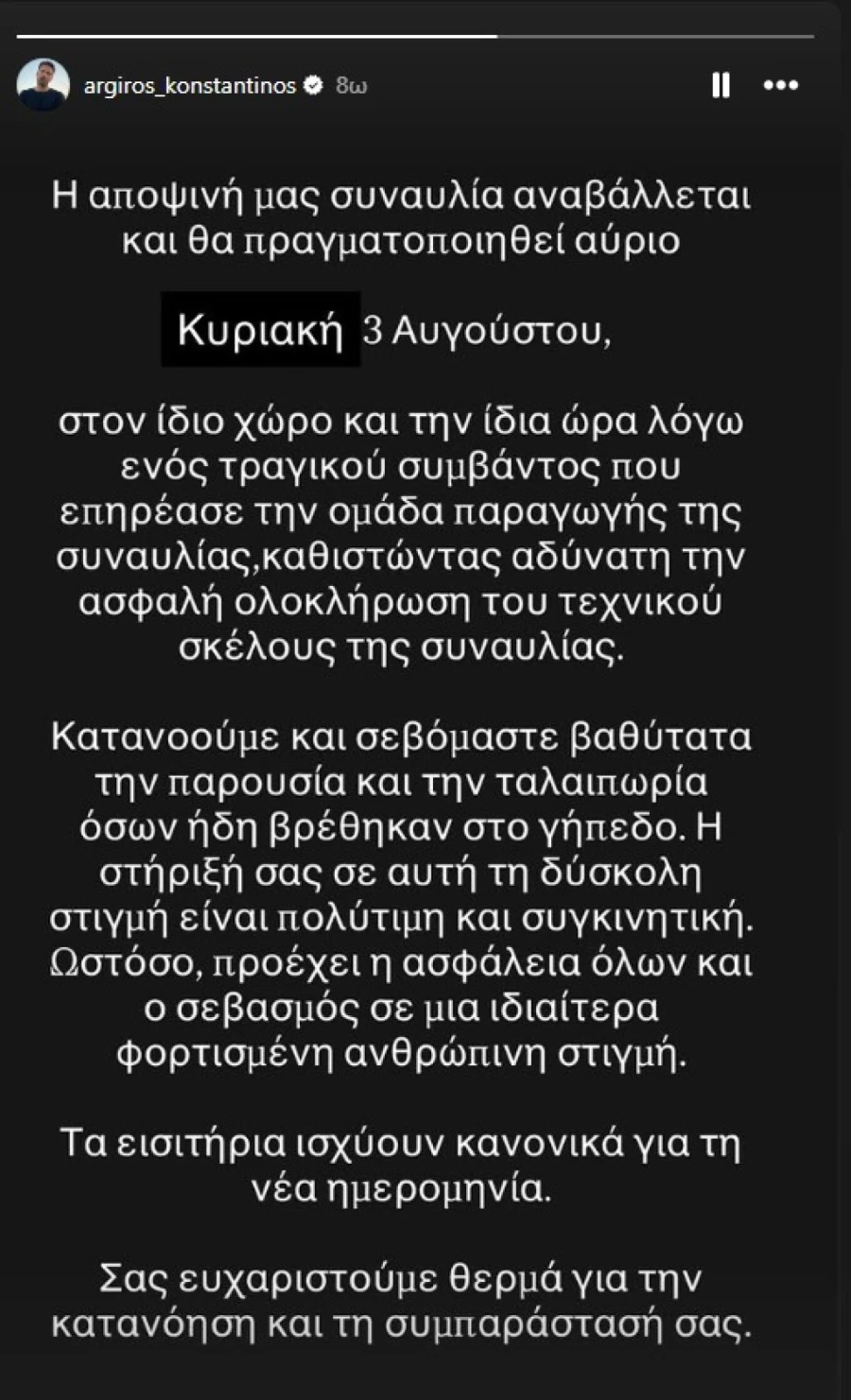 «Η αποψινή μας συναυλία αναβάλλεται και θα πραγματοποιηθεί αύριο, Κυριακή 3 Αυγούστου στον ίδιο χώρο και την ίδια ώρα, λόγω ενός τραγικού συμβάντος που επηρεάζει την ομάδα παραγωγής της συναυλίας, καθιστώντας αδύνατη την ασφαλή ολοκλήρωση του τεχνικού σκέλους της συναυλίας», ανέφερε χαρακτηριστικά στην ανάρτησή του.